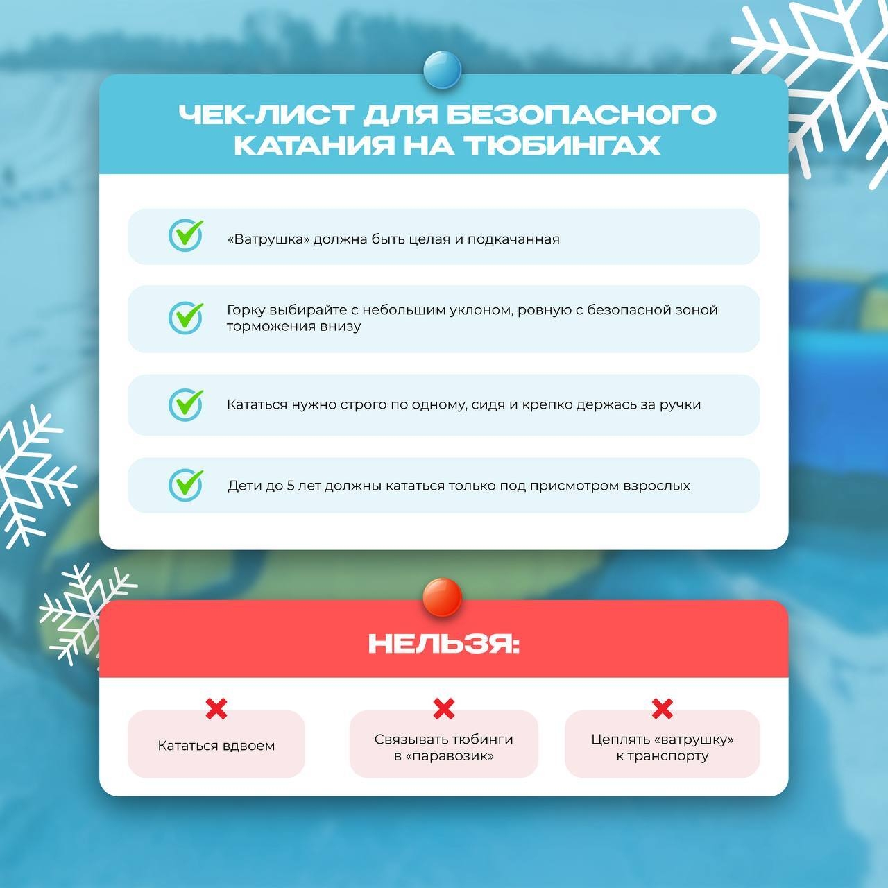 Сохраняйте чек-лист для безопасного катания на «ватрушках» и делитесь с друзьями.